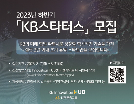 2023년 하반기 ‘KB스타터스’ 지원을 희망하는 스타트업은 KB Innovation HUB센터 공식 홈페이지(www.kbinnovationhub.com/apply)를 통해 신청이 가능하며, 자세한 모집과 관련한 사항은 홈페이지 내 모집공고를 통해 확인할 수 있다.