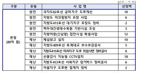 지역현안사업으로 ‘국지도82호선 금마지구 도로개선(10억 원)’, ‘지방어항(신남항) 접안시설 확충사업(12억 원)’, ‘지방도 미끄럼방지 포장사업(6억 원)’ 등이 선정됐으며, 재난안전사업으로 ‘제설창고 설치(10억 원)’, ‘산불감시 지능형 CCTV 설치(18억 원)’, ‘지방도 유지보수 사업(6억 원)’ 등이 선정됐다.
