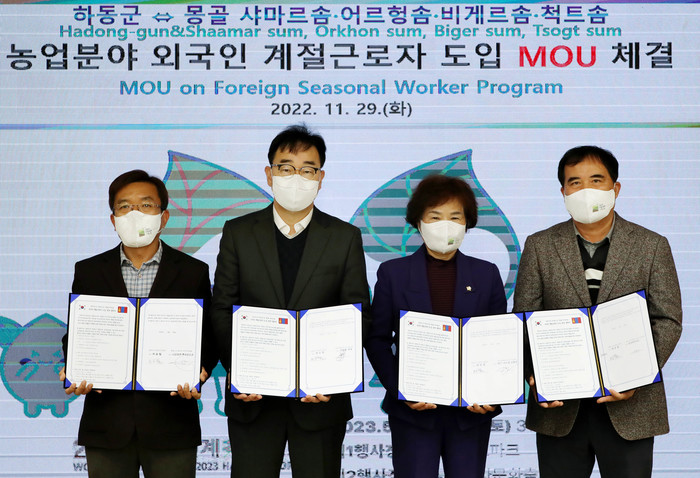 [프레스뉴스] 정재훈 기자= 하동군은 29일 농촌의 일손부족 문제 해결을 위해 다국적인 노력 끝에 몽골 지방정부인 샤마르솜, 어르헝솜, 비게르솜, 척트솜과 외국인 계절근로자 교류에 관한 업무협약을 체결했다.