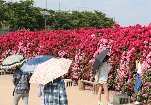 ▲26일 경북 경산시 하양읍 대부잠수교 인근 하양경관농업단지에 마련된 장미터널을 찾은 시민들이 활짝 핀 장미를 감상하고 있다.(사진= 뉴스1) |