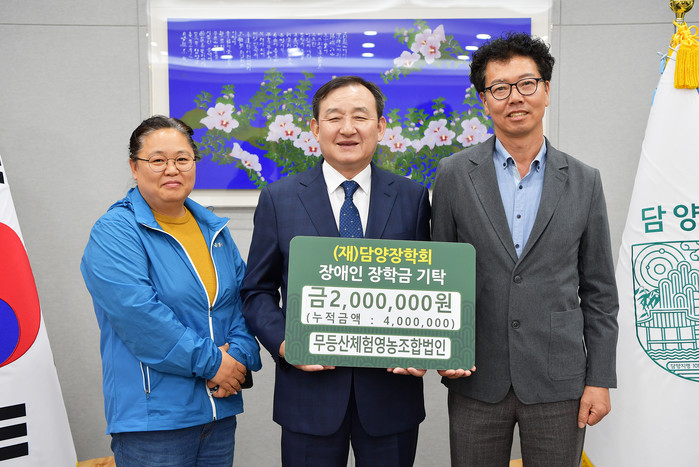 [전남=프레스뉴스] 박정철 기자=담양군(군수 이병노)은 지난 15일 무등산체험영농조합법인(대표 김명우)에서 지역인재 육성을 위해 장애인 장학금 2백만 원을 기탁했다고 전했다.