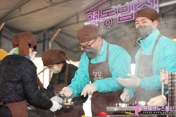 하나금융그룹은 하나은행, 하나카드, 하나생명 등 그룹 명동사옥에서 근무중인 관계사 임직원들의 자발적 참여로 지난해 12월부터 <명동밥집> 배식 봉사활동을 1년째 지속중이다. 특히, 이날은 추운 날씨 속 무료급식소를 찾는 지역사회 취약계층에게 따뜻한 금융의 온기를 나누고자 1,111그릇의 식사를 제공했다.
