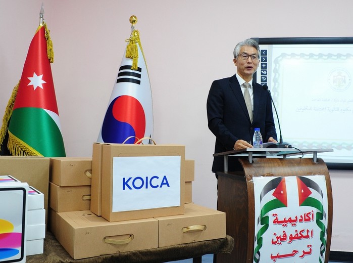 [프레스뉴스] 채정병 특파원= 13일(현지시간) 코이카(KOICA)의 첨단 국산 시각장애인 교육용 IT기기 '닷패드' 기증식이 김필우 주 요르단 대사, 아즈미 마하파자 요르단 교육부장관, 김소영 암만 코이카 사무소장 등이 참석해 요르단 암만 로얄 청각장애 학교에서 열린 가운데 김필우 대사가 축사를 하고 있다.