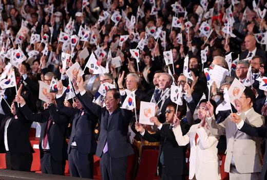| ▲한덕수 국무총리가 9일 오전 서울 종로구 세종문화회관에서 열린 제578돌 한글날 경축식에서 만세삼창을 하고 있다. (사진= 뉴스1) |