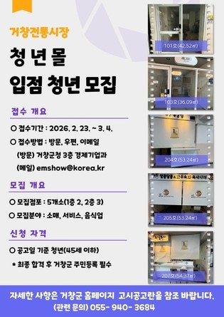 - [프레스뉴스] 박영철 기자=거창군은 전통시장 활성화와 청년 창업 기반 조성을 위해 거창전통시장 내 청년몰 ‘거창in140’에 입점할 청년 창업인...