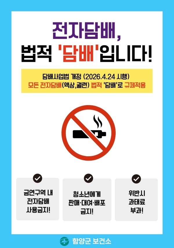 - [프레스뉴스] 박영철 기자=함양군 보건소는 전자담배를 포함한 모든 담배 제품의 금연구역 내 사용을 규제하는 「담배사업법」 개정에 따라 오는 24...
