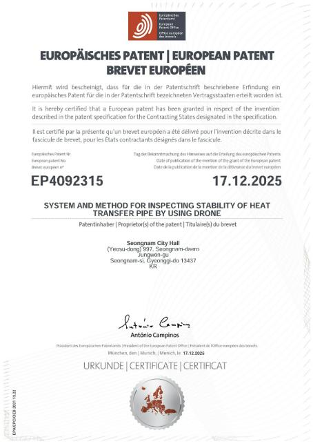 | ▲ 성남시가 개발한 '드론 열수송관 안정성 검사' 유럽 특허등록증 |