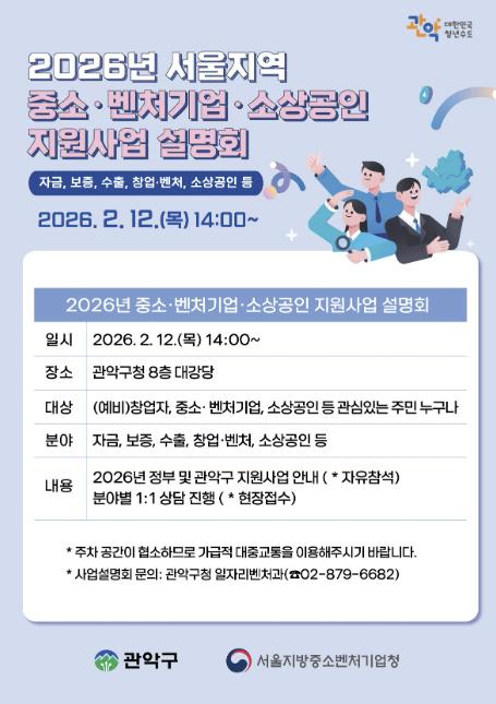 관악구가 지역 경제의 주축인 중소·벤처기업과 소상공인의 경영 안정을 돕고, 혁신 성장의 발판을 마련하기 위한 대규모 정책 소통의 장인 오는 12일(목) 14시 관악구청 8층 대강당에서 ‘2026년 중소벤처기업·소상공인 지원사업 설명회’를 개최한다.