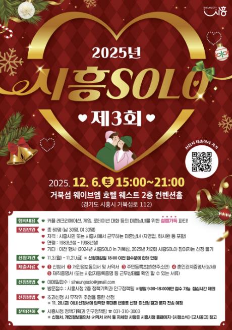 시흥시는 만남의 기회가 부족한 청춘남녀들에게 소중한 인연을 만날 기회를 제공하고 결혼 친화 분위기를 조성하기 위해 ‘2025년 제3회 시흥 솔로(SOLO)’ 행사를 개최하고, 미혼남녀 참가자를 모집한다.