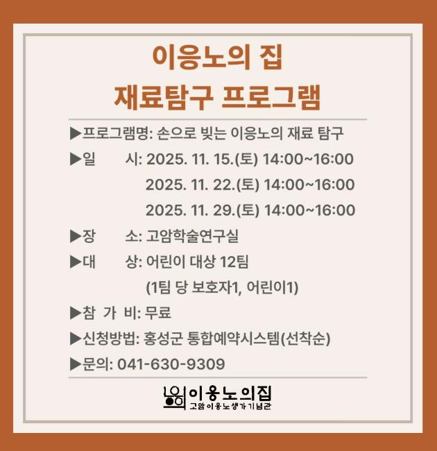 홍성군 고암이응노생가기념관은 오는 15일, 22일, 29일(매주 토요일) 오후 2시부터 4시까지 ‘재료탐구 프로그램’을 운영한다고 밝혔다.