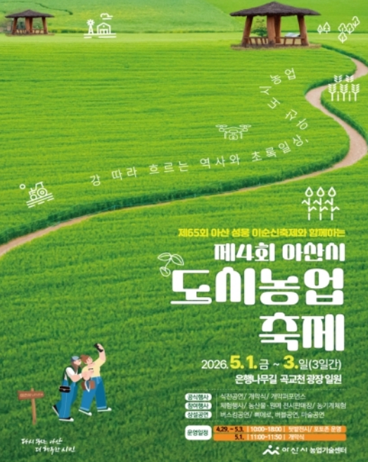 아산시는 ‘제65회 아산 성웅 이순신축제’와 연계한 ‘제4회 아산시 도시농업축제’를 오는 5월 1일부터 3일까지 3일간 은행나무길 곡교천 광장 일원에서 개최한다.