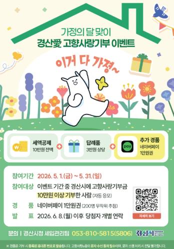 경산시 관계자는 “가정의 달을 맞아 고향사랑기부제를 통해 지역 사랑의 마음을 전하는 뜻깊은 계기가 되길 바란다”며 “기부자에게는 다양한 혜택이 제공되는 만큼 많은 관심을 부탁드린다”고 전했다.