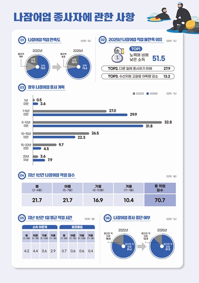 나잠어업 종사 경력의 평균은 37.2년으로, 전 주기(2022년) 대비 3.3년 감소했으며, 향후 20년 이상 나잠어업을 지속할 계획이라고 응답한 비율은 7.9%로 전 주기 대비 4.3%p 증가해 장기 종사 의향이 확대된 것으로 나타났다.