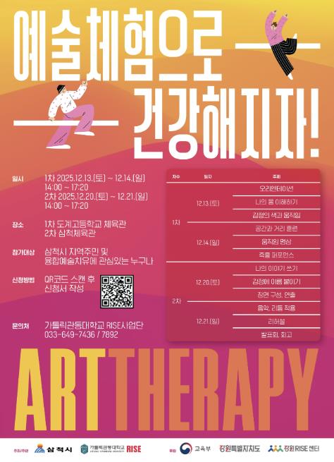 삼척시는 가톨릭관동대학교 RISE 사업단과 협력하여 지역 자연자원을 활용한 ‘융합예술치유 프로그램’을 오는 12월 도계고등학교 체육관과 삼척체육관에서 개최한다.