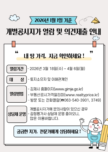 김제시는 2026년 1월 1일 기준으로 조사․산정한 개별공시지가 총 307,692필지에 대해 18일부터 오는 4월 6일까지 열람 및 의견 접수를 실시한다고 밝혔다.