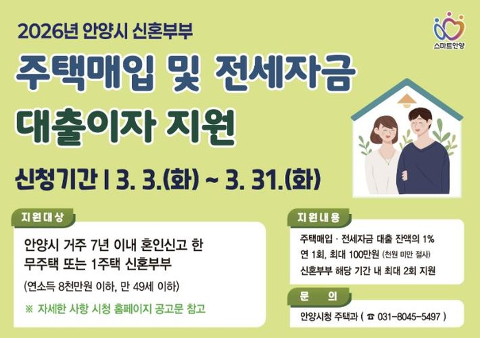 안양시가 ‘2026년 신혼부부 주택매입 및 전세자금 대출이자 지원사업’을 시행한다고 4일 밝혔다.