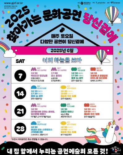 2025년도 ‘찾아가는 문화공연’ 사업은 광주시의 시민 체감형 문화정책 실현의 일환으로, 5개 구별 야외 거점공연장에서 매주 토요일 다양한 공연을 펼친다.