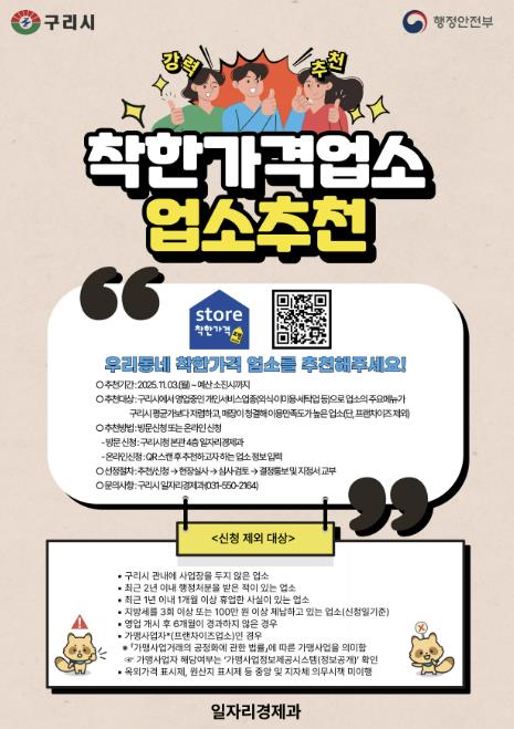 구리시는 물가 상승 등 어려운 경제 여건 속에서도 저렴한 가격과 친절한 서비스를 제공하는 지역 소상공인을 발굴하기 위해, 11월 3일부터 '우리 동네 착한가격업소를 추천해 주세요' 시민참여 캠페인을 전개한다고 밝혔다.
