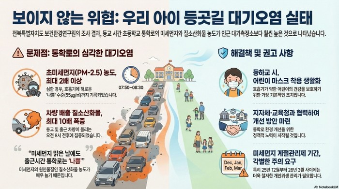전북특별자치도 보건환경연구원(원장 전경식)은 11일 도내 초등학교 통학로를 대상으로 실시한 대기오염 실태조사 결과를 발표하며, 어린이 건강 보호를 위한 통학로 미세먼지 대응 필요성을 강조했다.