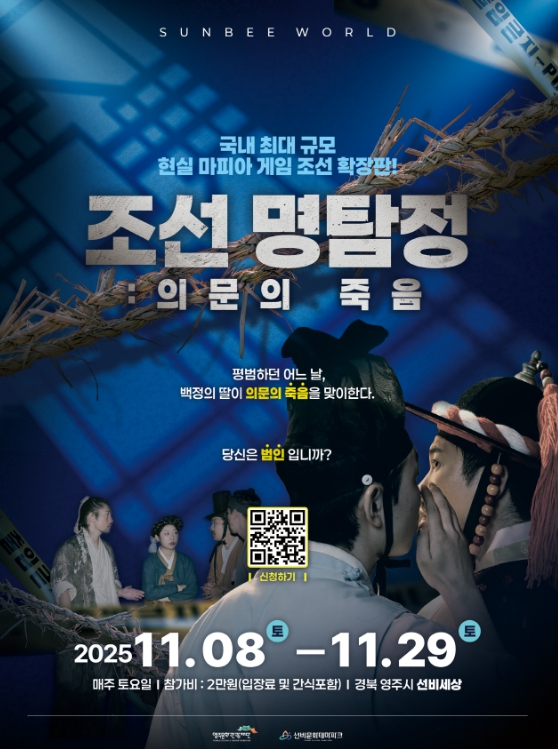 영주시 선비세상에서 오는 11월 8일부터 매주 토요일, 참가자가 직접 조선시대 인물이 되어 연쇄 살인 사건의 진실을 밝혀야 하는 국내 최대 규모 체험형 마피아 게임 ‘조선명탐정: 의문의 죽음’이 개최된다.