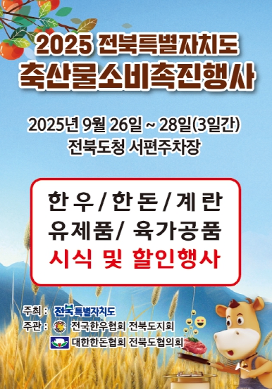 전북특별자치도가 추석 명절을 맞아 도민들에게 안전하고 품질 좋은 축산물을 저렴하게 제공하기 위해 ‘2025년 축산물 소비촉진행사’를 연다. 도는 이번 행사를 9월 26일부터 28일까지 사흘간 도청 서편광장에서 개최한다고 23일 밝혔다.