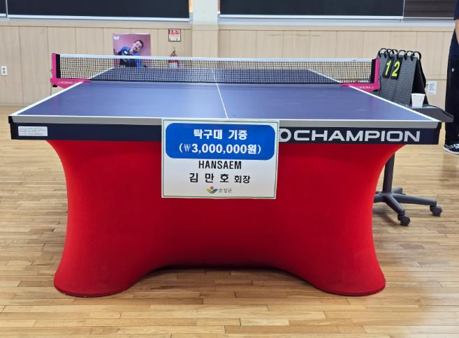 순창군은 순창군 금과면 출신인 HANSAEM 김만호 회장이 31일 순창시니어클럽에 300만 원 상당의 탁구대 2대를 기증했다고 밝혔다.