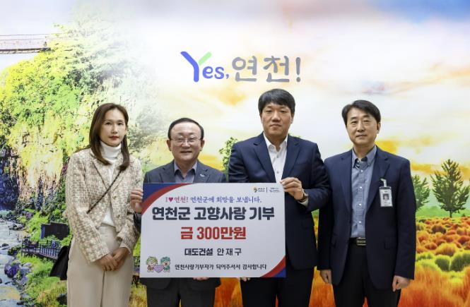 연천군은 11월 3일 군수실에서 고향사랑기부제 기탁식을 열고, (주)대도건설 안재구 대표로부터 300만 원의 고향사랑기부금을 전달받았다고 밝혔다.