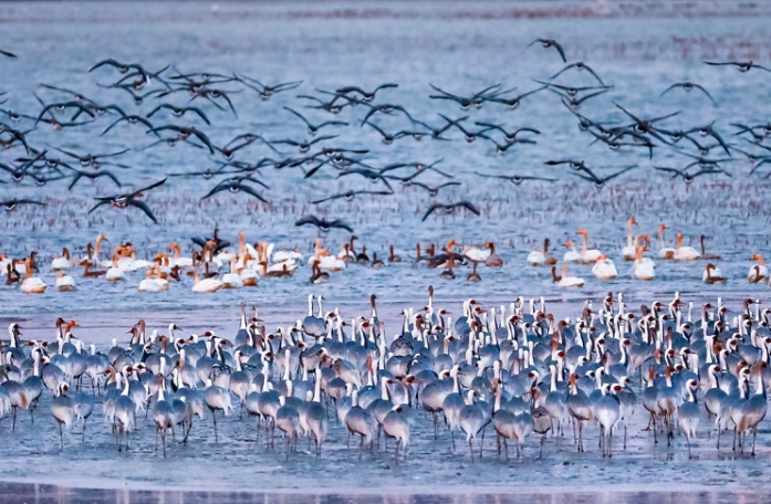 광할한 저수지를 배경으로 가을 하늘을 수놓는 철새의 향연