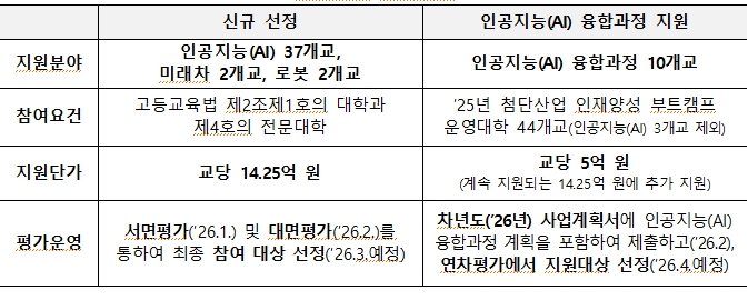 - 2026년 대학과 기업이 함께하는 ‘첨단산업 인재양성 부트캠프’ 인공지능(AI) 37개교, 미래차 2개교, 로봇 2개교를 선정하여, 총 8개 분야 88개교 지원