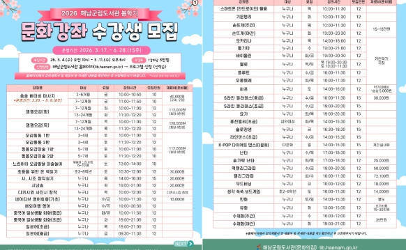 해남군은 군립도서관의 2026년 봄학기 문화강좌 수강생을 모집한다.