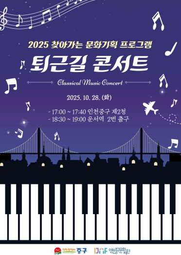 (재)인천중구문화재단(이사장 김정헌)은 오는 28일 저녁 퇴근길 시민들을 위한 특별한 문화 행사 ‘2025 영종 퇴근길 콘서트’를 개최한다.