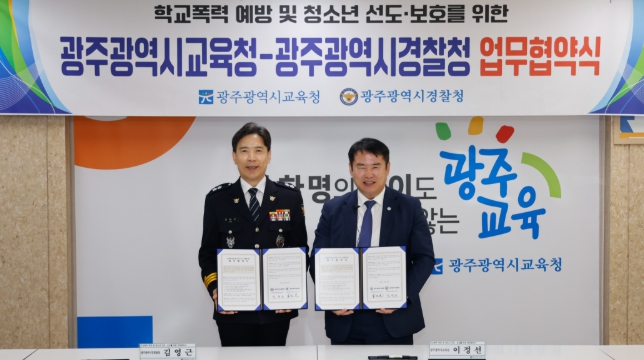 광주시교육청은 31일 본청 상황실에서 광주광역시경찰청과 이정선 교육감과 김영근 광주경찰청장 등이 참석한 가운데 ‘학교폭력 예방 및 청소년 선도·보호’를 위한 업무협약을 체결했다.