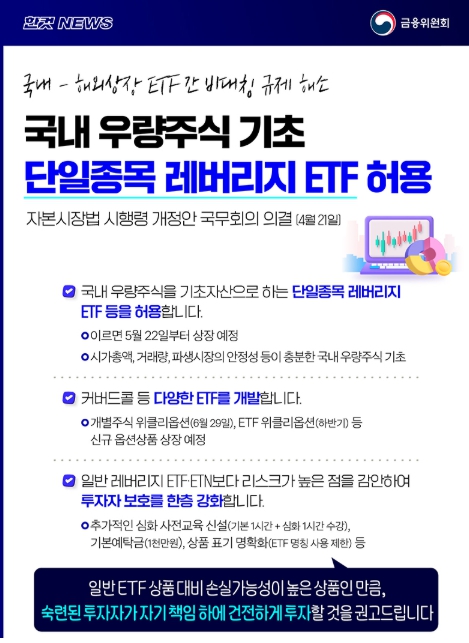· 국내 우량주식을 기초자산으로 하는 단일종목 레버리지 ETF 등을 허용합니다.