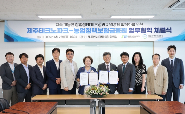제주테크노파크(원장 지영흔, 제주TP)와 농업정책보험금융원(원장 서해동, 농금원)은 26일 오전 제주벤처마루에서 지속 가능한 창업생태계 조성과 지역경제 활성화를 위한 업무협약을 체결했다.