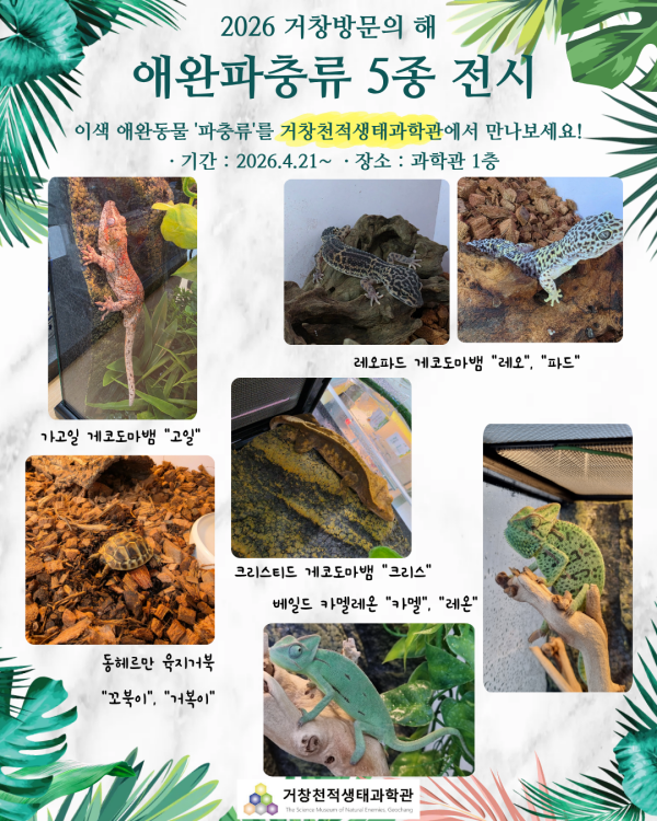 거창천적생태과학관은 매주 수요일을 제외하고 오전 10시부터 오후 5시까지 운영되며, 이번 전시 및 체험 프로그램은 별도의 사전 예약 없이 무료로 자유롭게 관람과 체험이 가능하다.