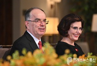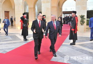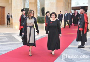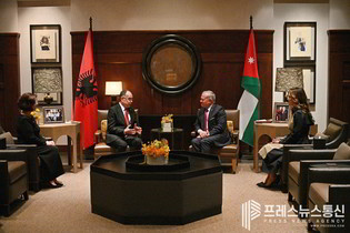 [프레스뉴스] 채정병 특파원=22일(현지시간) 요르단을 방문한 바이람 베가이 알바니아 대통령 내외 환영만찬에서 라니아 왕비가 밝은 표정으로 이야기를 듣고 있다. 2004년 타임지 선정 '세계에서 가장 영향력 있는 100인', 포브스 '세계에서 가장 영향력 있는 여성' 등에 이름을 올린 라니아 왕비는 교육개혁, 난민지원, 여성인권문제 등에 적극 나서며 대표적인 아랍여성 지도자상으로 평가받아 왔다. (사진=채정병 특파원)