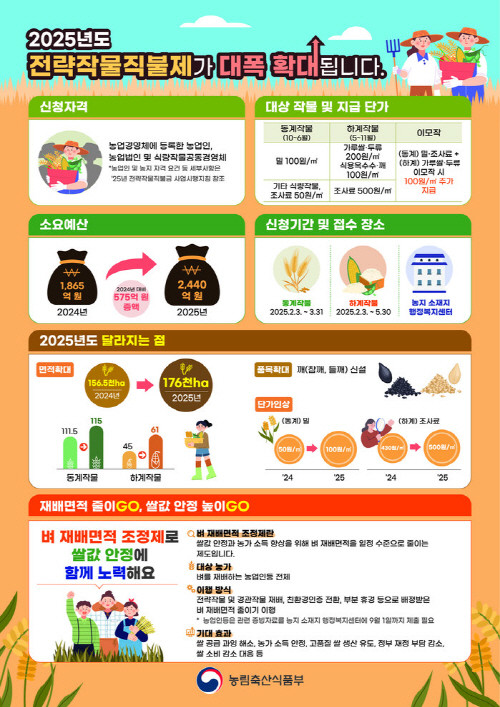 한편, 올해부터 하계작물로 깨(참깨, 들깨)가 추가됐으며, 밀(동계)의 직불금 ha당 단가는 지난해 50만 원에서 100만 원으로, 조사료(하계)는 430만 원에서 500만 원으로 각각 상향됐다.