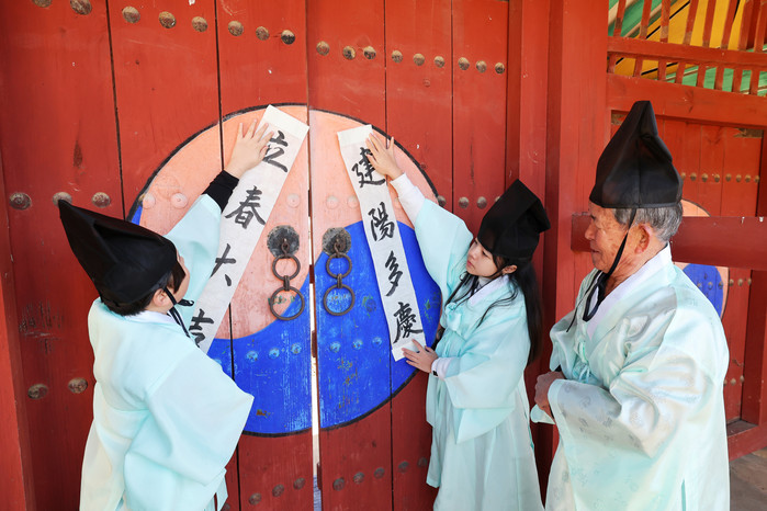 | ▲ 24절기 중 첫 절기이자 봄의 시작을 알리는 입춘(立春·2월 4일)을 맞이해 지난 2일 충북 괴산군 연풍향교 외삼문에 유림과 어린이들이 군민의 무사 안녕과 한 해의 복을 기원하는 입춘첩을 붙이고 있다./사진-괴산군 제공 |