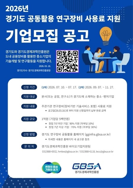 | ▲2026년 경기도 공동활용 연구장비 사용료 지원 기업모집 공고 포스터(사진=경기도) |