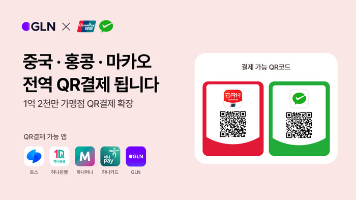 이번 글로벌 QR결제 서비스는 GLN 앱은 물론 하나은행, 하나머니, 하나카드, 토스 등 주요 제휴 앱에서도 동일한 환경을 지원한다. GLN은 이번 글로벌 런칭을 기념해 내년 2월 말까지 프로모션으로, 중국(홍콩·마카오 포함) 전역의 오프라인 가맹점에서 100위안(CNY) 이상 결제 시 10% 캐시백 혜택을 제공키로 했다.