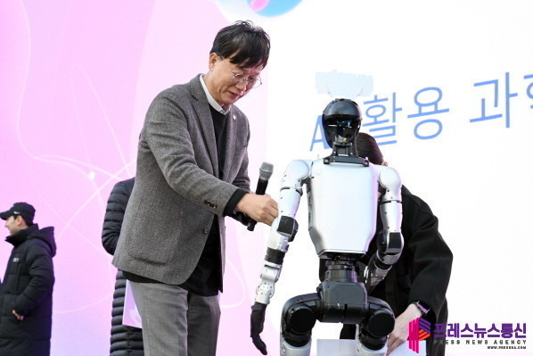 | ▲이민근 안산시장이 지난 2일 ‘2025 안산사이언스밸리(ASV) 과학축제’ 기념식 행사를 함께 진행한 휴노(휴머노이드 로봇)로부터 수상자 명단을 전달받고 있다.(사진=안산시) |