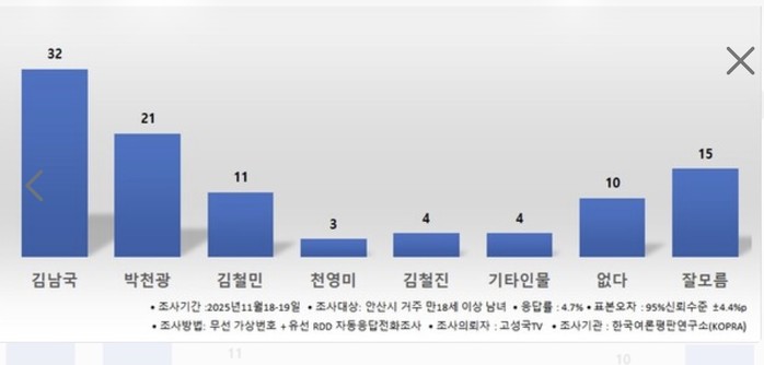 처음 여론조사가 눈길을 끈 것은 지난해 11월 조사인데, 출마여부를 결정하지 않았던 김남국 전 국회의원(32%)을 선두로 두고 박천광 예비후보(21%)와 김철민 전 국회의원(11%)이 각각 1, 2위를 차지한 점이다. 이 여론조서에서 여타 후보는 4% 이하였다.