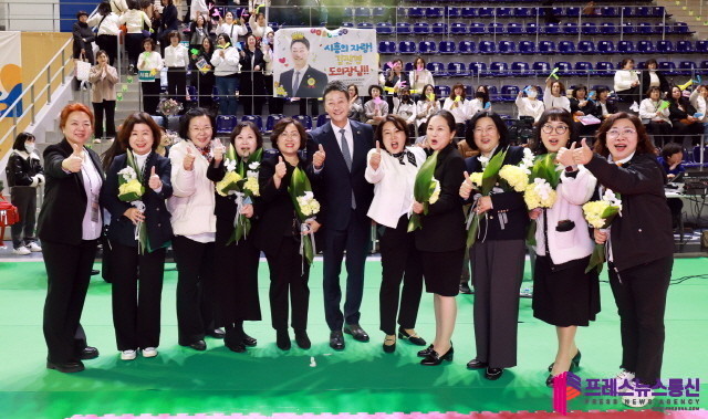 | ▲김진경 경기도의회 의장이 지난 30일 오후 용인 실내체육관에서 열린 ‘2025년 경기보육인대회’ 개회식에서 참석자들과 기념촬영을 하고 있다.(사진=경기도의회) |