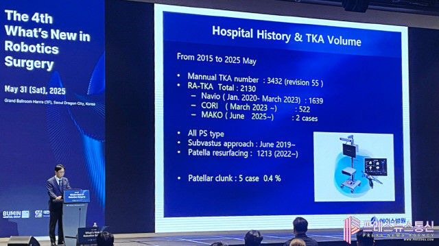 | ▲에이스병원의 정재훈 대표원장이 2025년 5월 31일, 서울 부민병원에서 열린 제4회 로봇 인공관절 수술 심포지엄에서 무릎 인공관절 로봇 수술 분야의 최신 임상 성과를 발표하고 있다.(사진=에이스병원) |