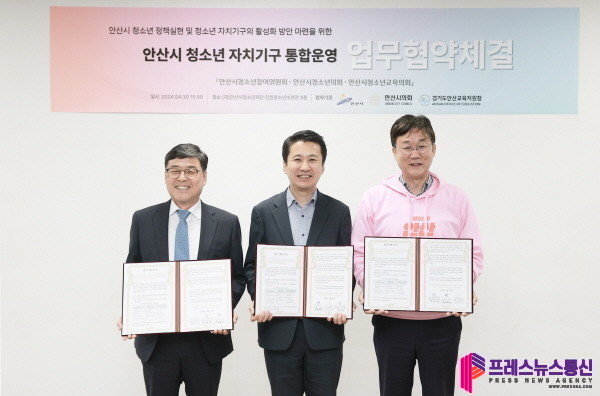 [프레스뉴스] 류현주 기자= 안산시의회(의장 송바우나)가 안산청소년의회의 내실 있는 운영을 위해 타 기관과의 협업을 추진하고 있는 가운데 30일 관련 협약을 체결했다.