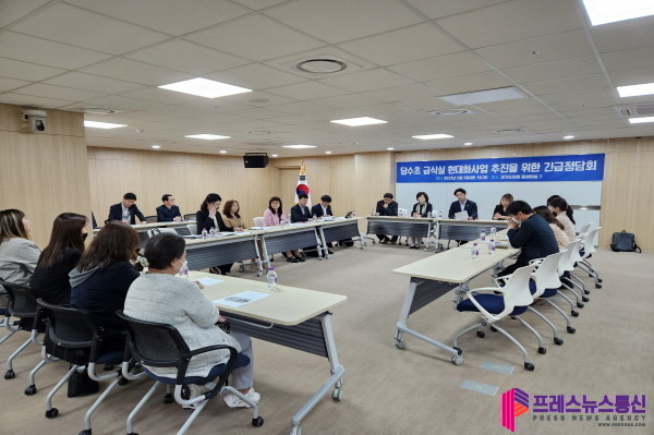 [프레스뉴스] 김대일 기자= 경기도의회 문화체육관광위원회 황대호(더불어민주당, 수원3) 부위원장은 9일 경기도의회 중회의실에서 당수초등학교 운영위원회·학부모, 당수초등학교장, 수원교육지원청 및 경기도교육청 관계 공무원 등이 참석한 가운데 당수초등학교 급식실 현대화사업 추진을 위한 긴급 정담회를 개최했다.