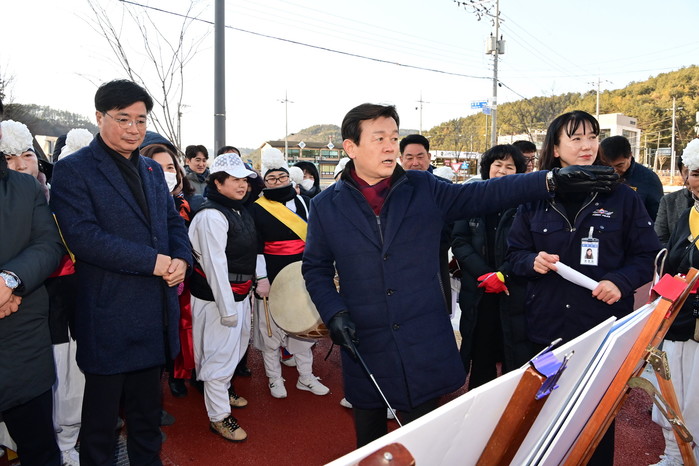| ▲조규일 진주시장은 10일 ‘새미골 회전교차로 개선공사’ 현장을 찾아 회전교차로와 버스베이, 교통 안전시설 등을 점검하고 공사 관계자들을 격려했다. (사진=진주시) |