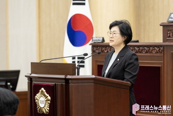 | ▲김진숙 의원이 지난 28일 ‘지방자치단체 출자·출연기관의 운영에 관한 법률 개정 촉구 건의안’에 대해 제안 설명을 하고 있는 모습.(사진=안산시의회) |