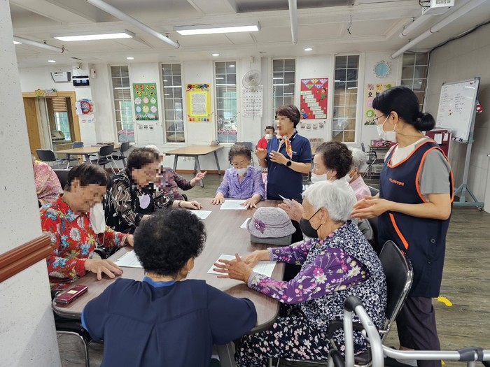 | ▲주간보호센터 이용 어르신들이 치매예방 프로그램에 참여하고 있다.(사진제공=화순군) |