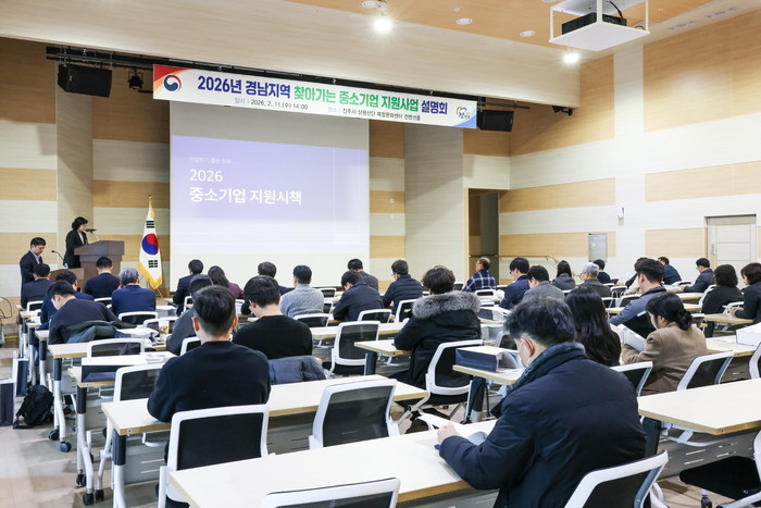| ▲진주시는 2월 11일 진주창업지원센터 컨벤션홀에서 경남지방중소벤처기업청, 경상남도, 중소벤처기업진흥공단과 공동으로 '2026년 경남지역 찾아가는 중소기업 지원사업 설명회'를 열었다. (사진=진주시) |